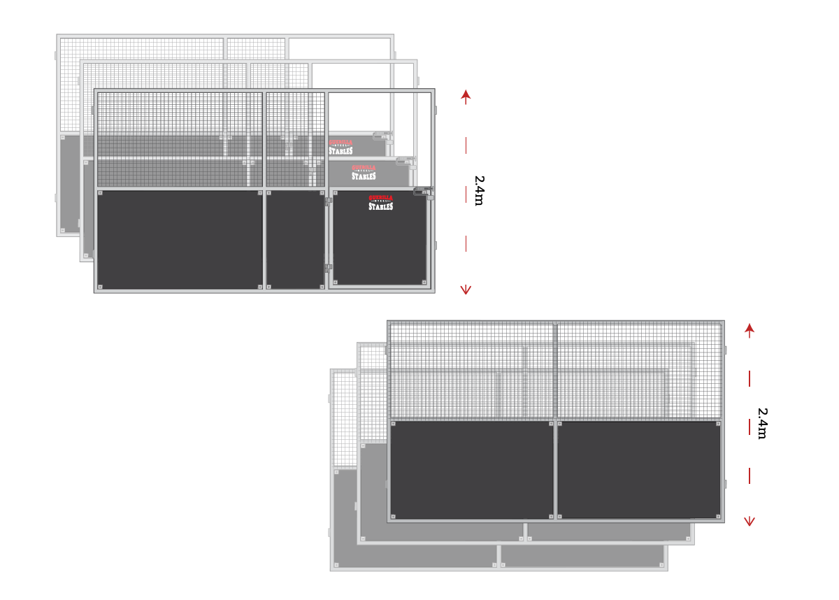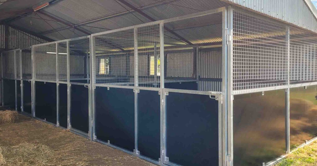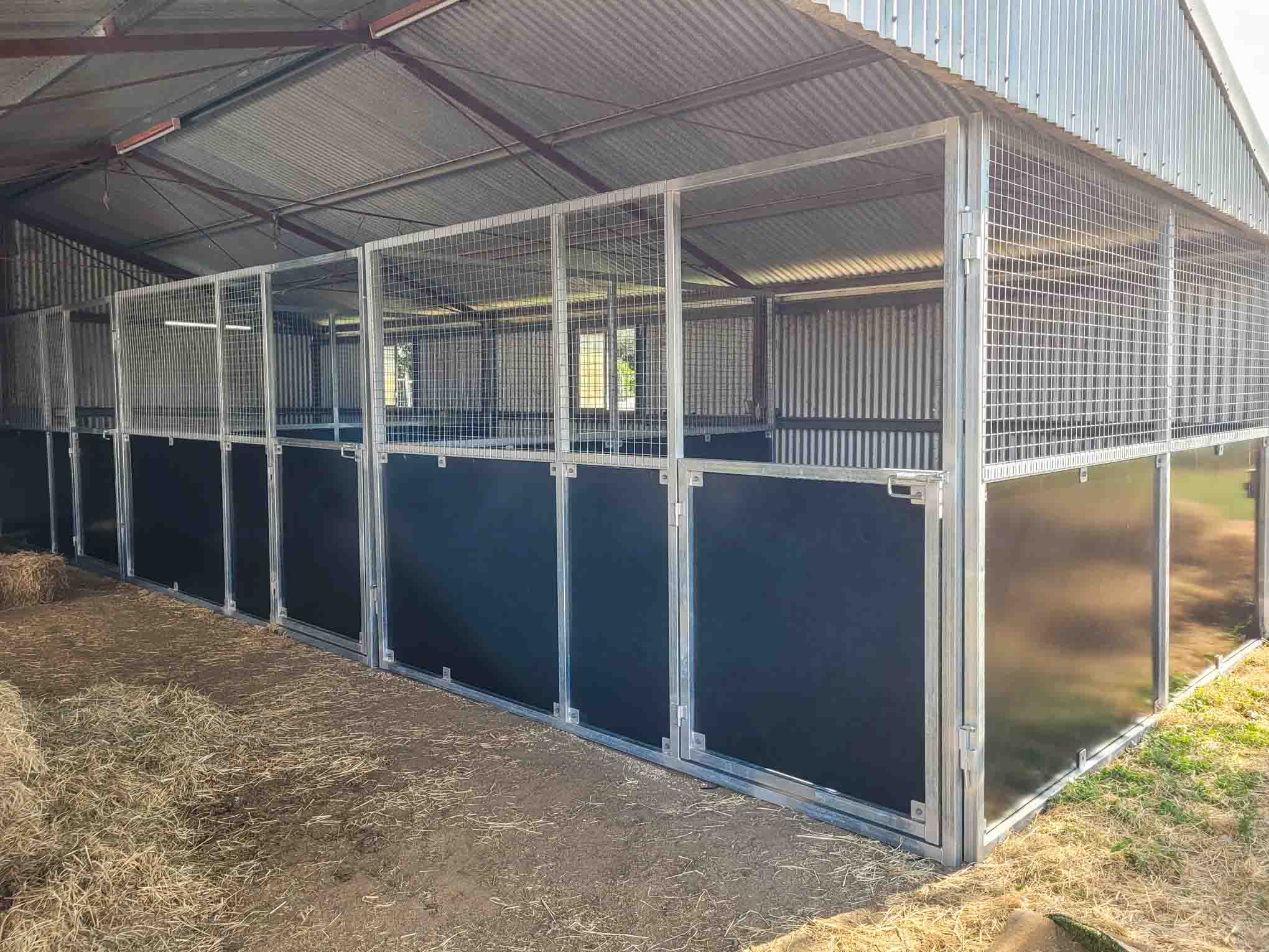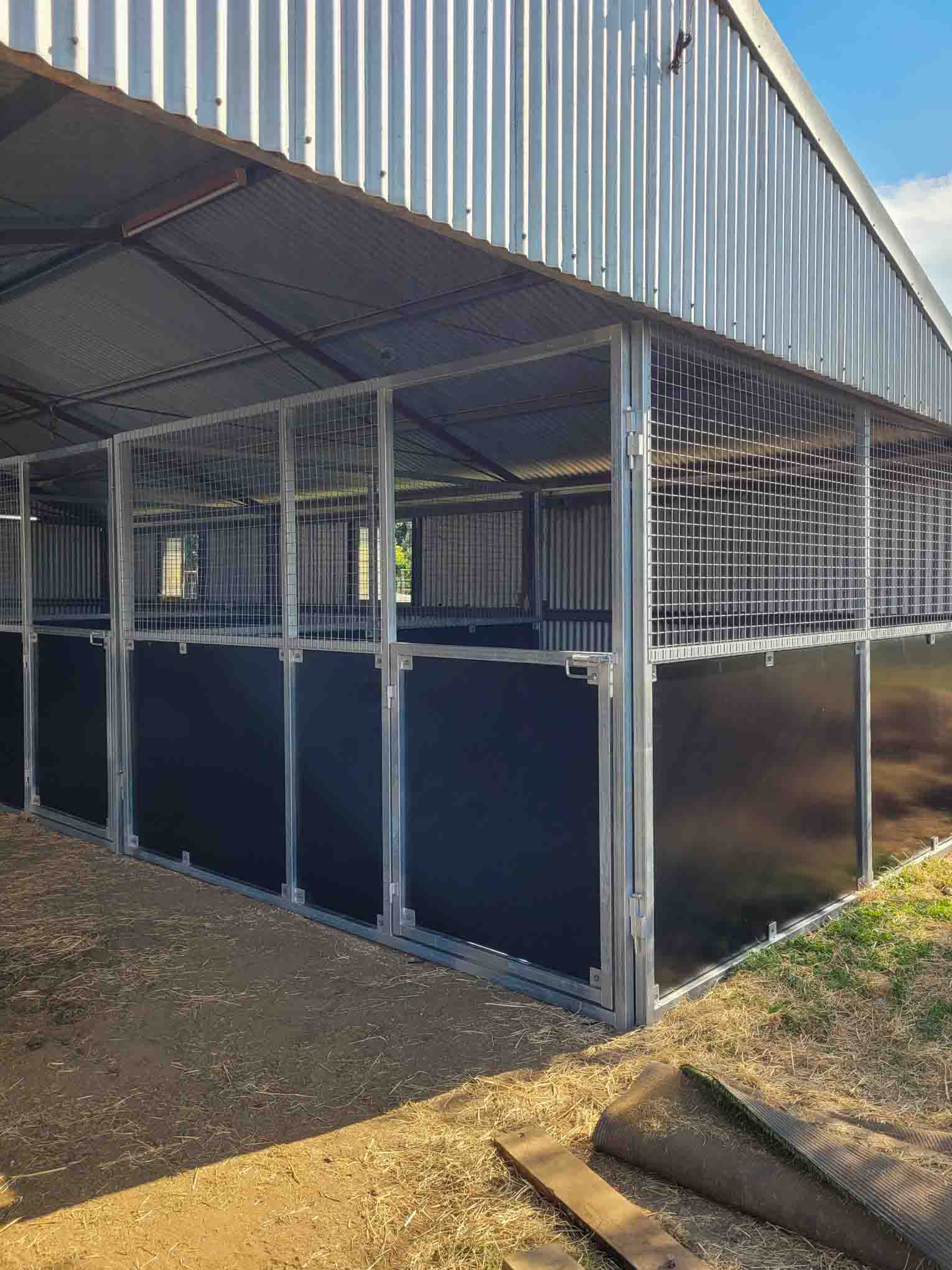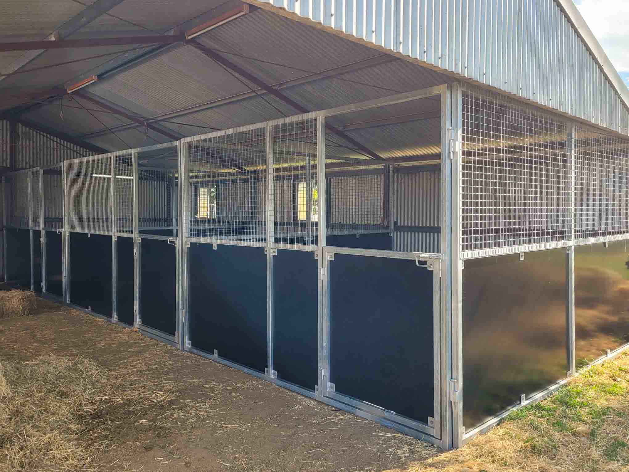 The panels use a proven ply-and-mesh combination design. Solid form ply kickboards protect the lower half of the stall from kicks and wear, while heavy galvanised mesh above allows air and light to move freely between boxes and through the shed. Horses can see each other and the wider shed space, which typically reduces stress compared with fully enclosed stalls.