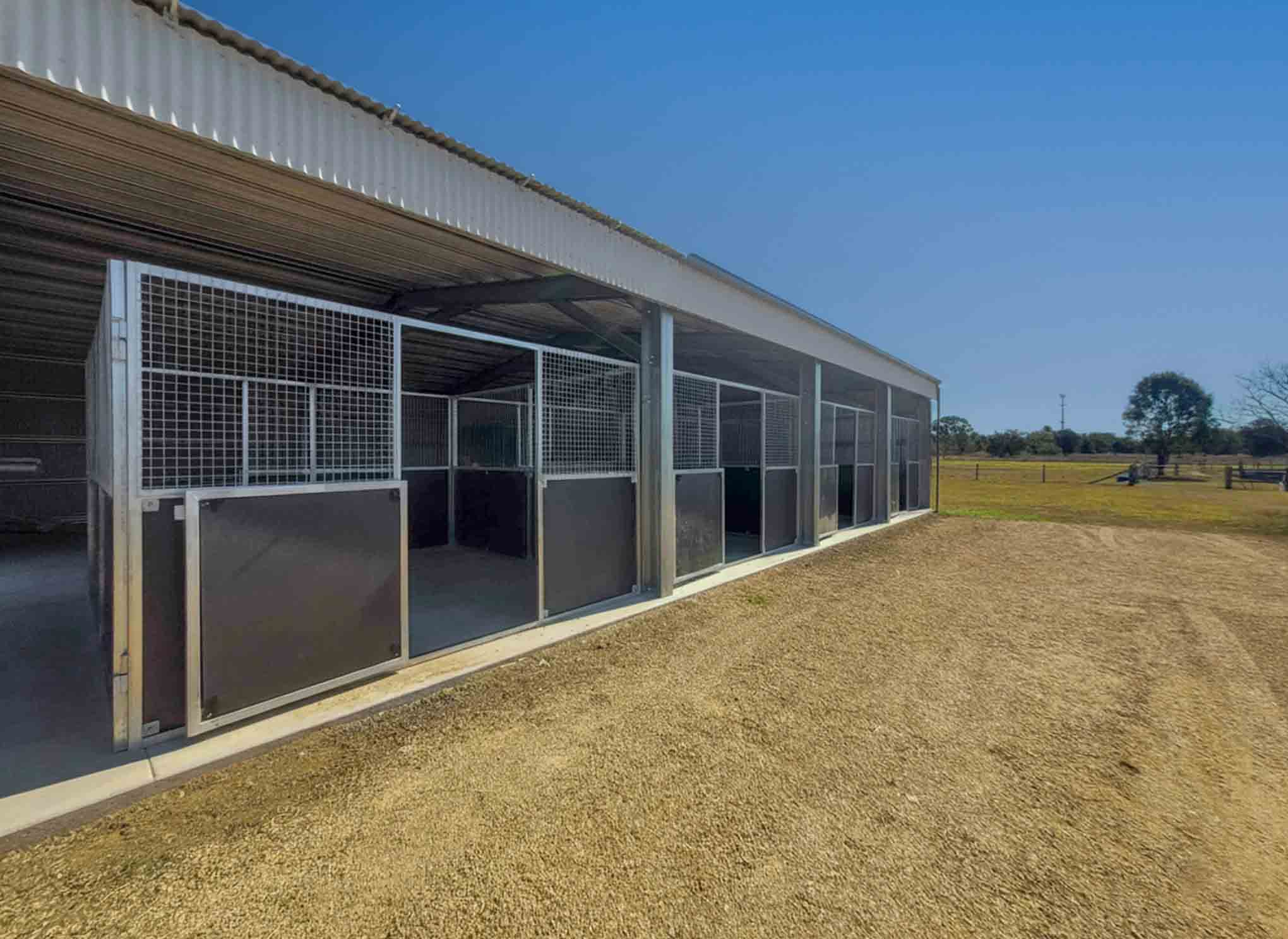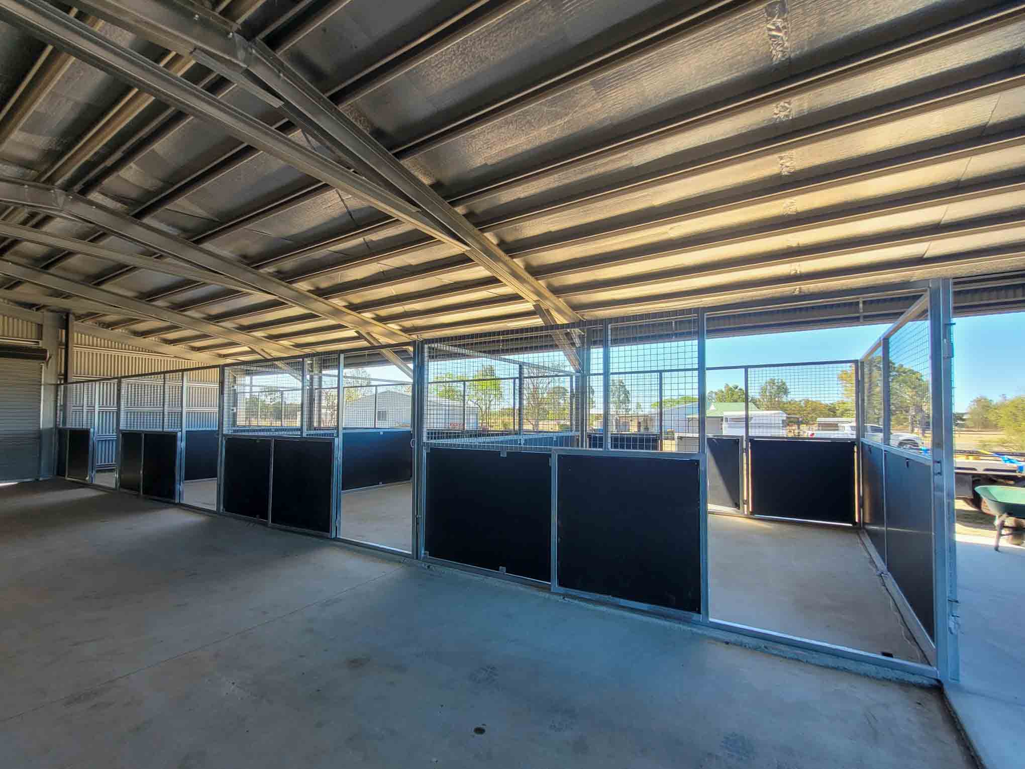 The solution was a modular four-bay indoor stable system installed along the front shed opening and 2 fully enclosed bays along the rear wall. Heavy-duty steel stall panels with solid kick boards and mesh uppers created safe, durable horse bays while maintaining airflow and visibility between horses. Each stall connects directly to a steel day yard outside the shed, giving horses controlled turnout while keeping the stable area organised and easy to manage.