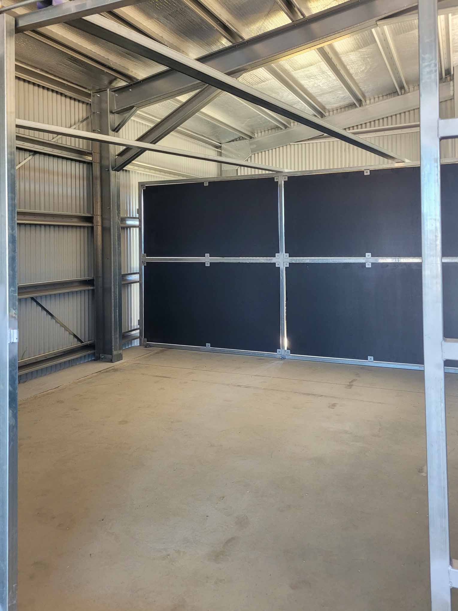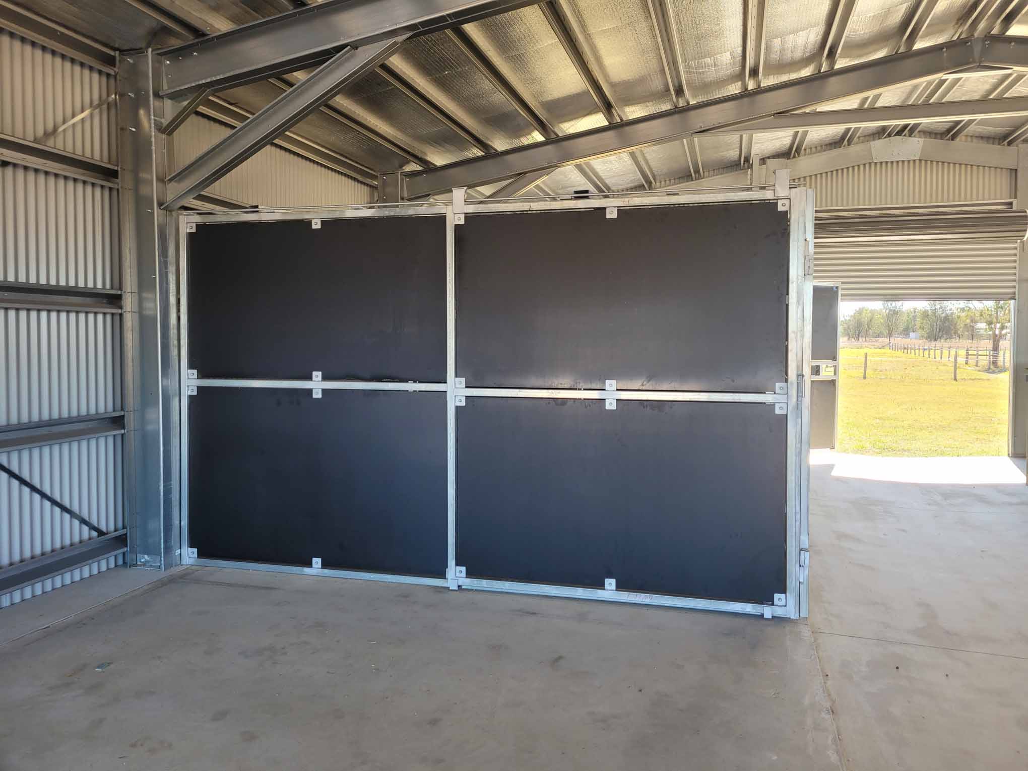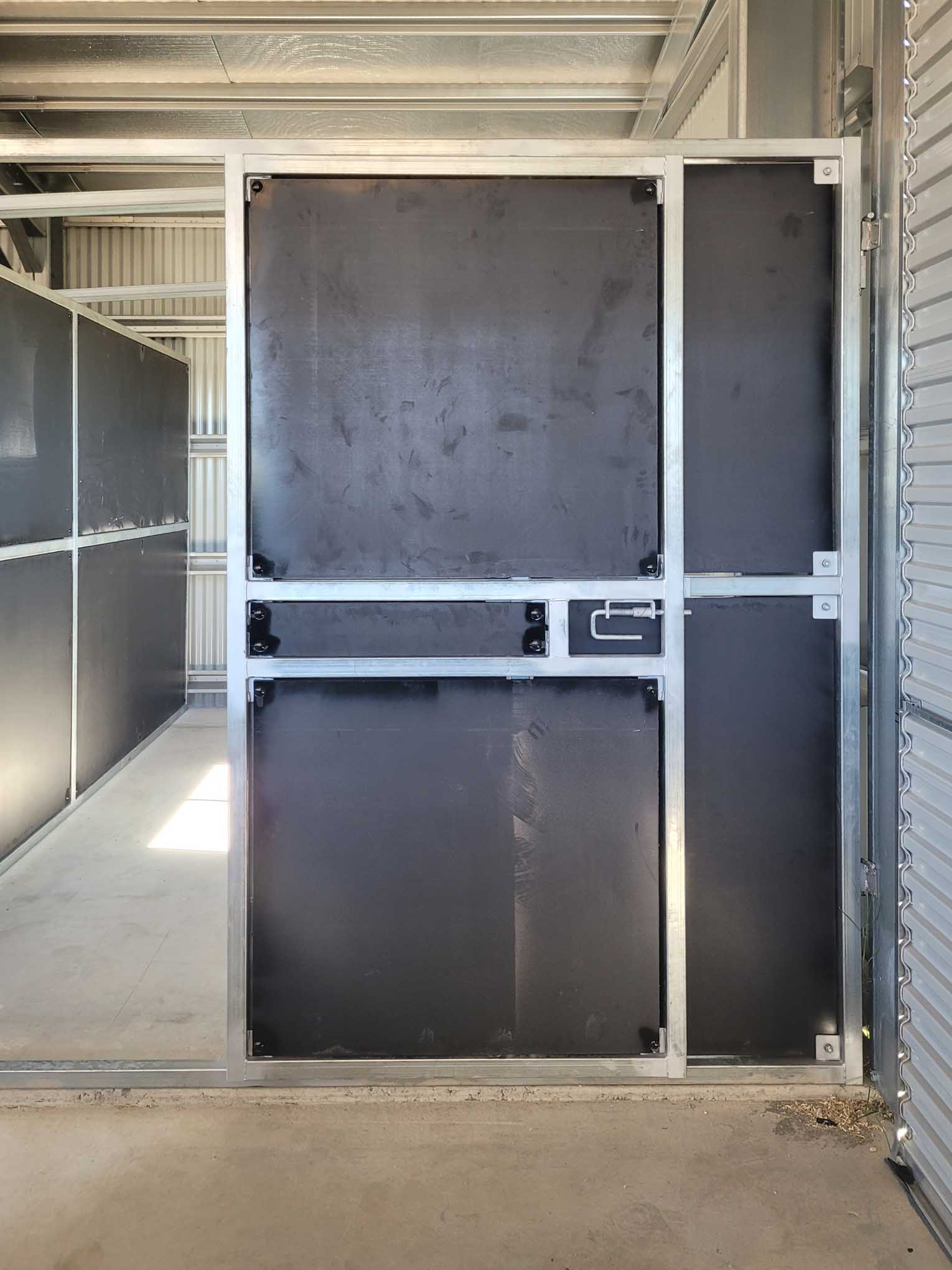 At the rear of the shed are two additional extra-large fully enclosed bays. One features a two metre wide sliding gate with a reinforced full-ply panel. This area could serve as a temporary recovery stall, isolation space, or controlled holding area depending on the owner’s needs. Due to the enclosed nature of the panels, these bays may also be used as secure storage or feed areas.