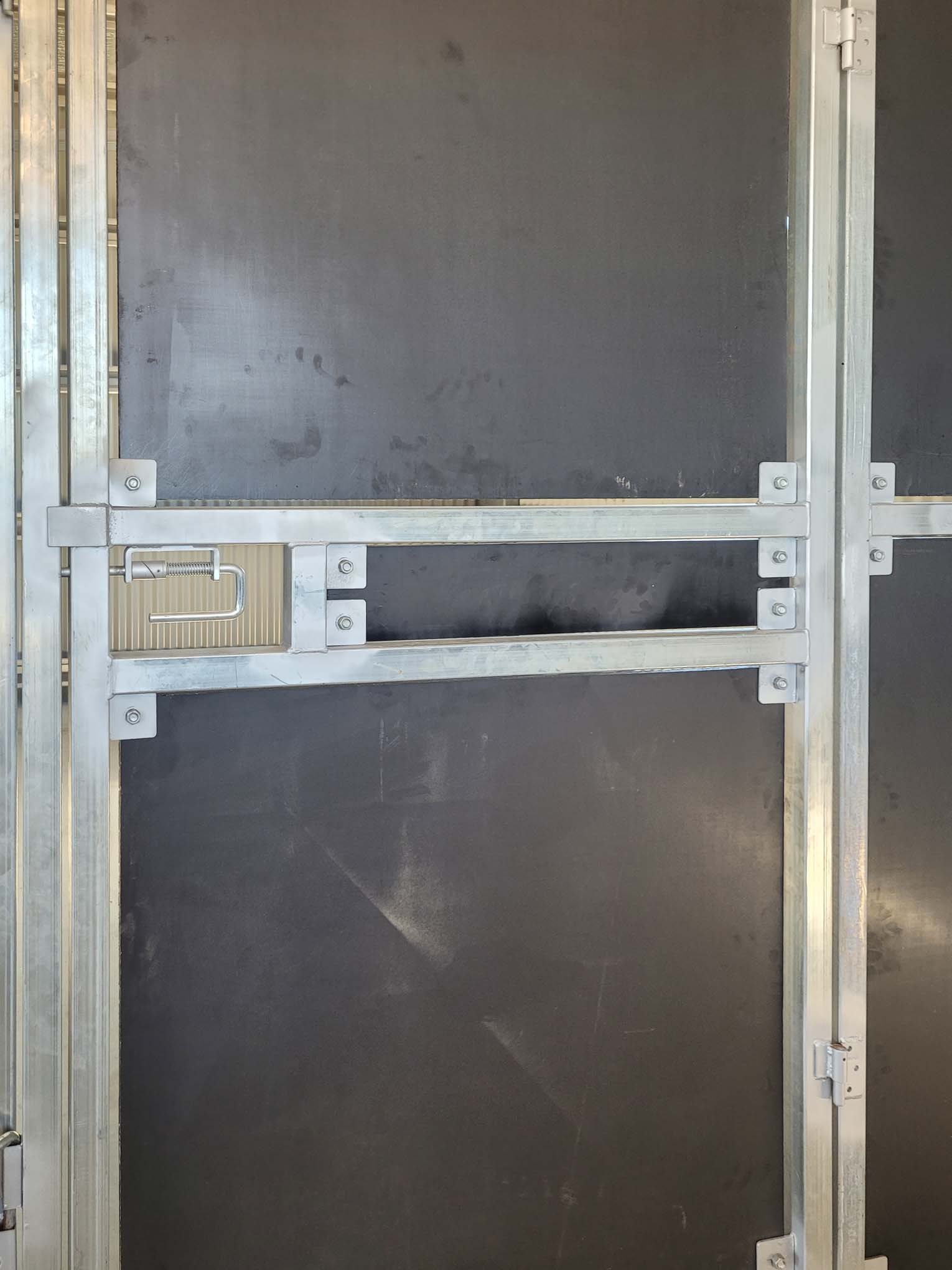 All four front stalls use a combination of solid form ply kick panels and mesh upper sections. The ply provides impact resistance and protects the structure from kicking, while the mesh improves airflow and allows horses to maintain visual contact with neighbouring horses. Gates include spring-assisted closing and a reinforced latch welded directly to the panel frame for durability and secure operation.