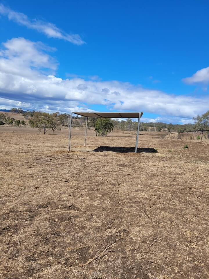 These shelters were fabricated and concreted onsite using the client’s own materials, designed for strength, shade, and long-term use in open paddocks.