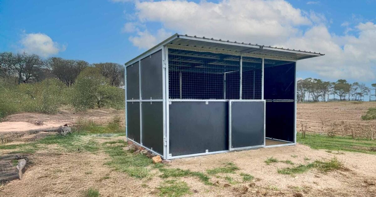 A DIY-friendly 4m x 4m horse stable with full ply rear and sides and ply/mesh combo front. Australian prefab 50mm RHS steel tube frame. Designed for wet weather paddock shelter.