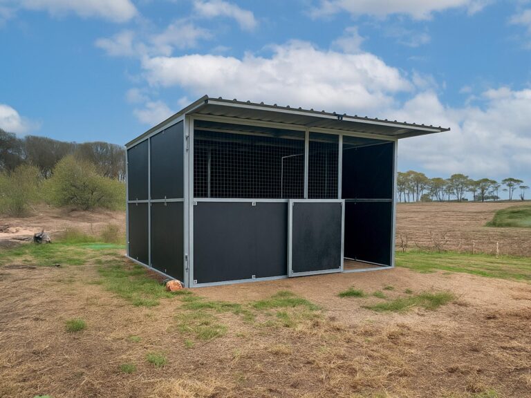 A simple 4m x 4m DIY stable built on compacted road base for drainage and durability. Balanced use of ply and mesh creates airflow, safety, and a secure shelter.