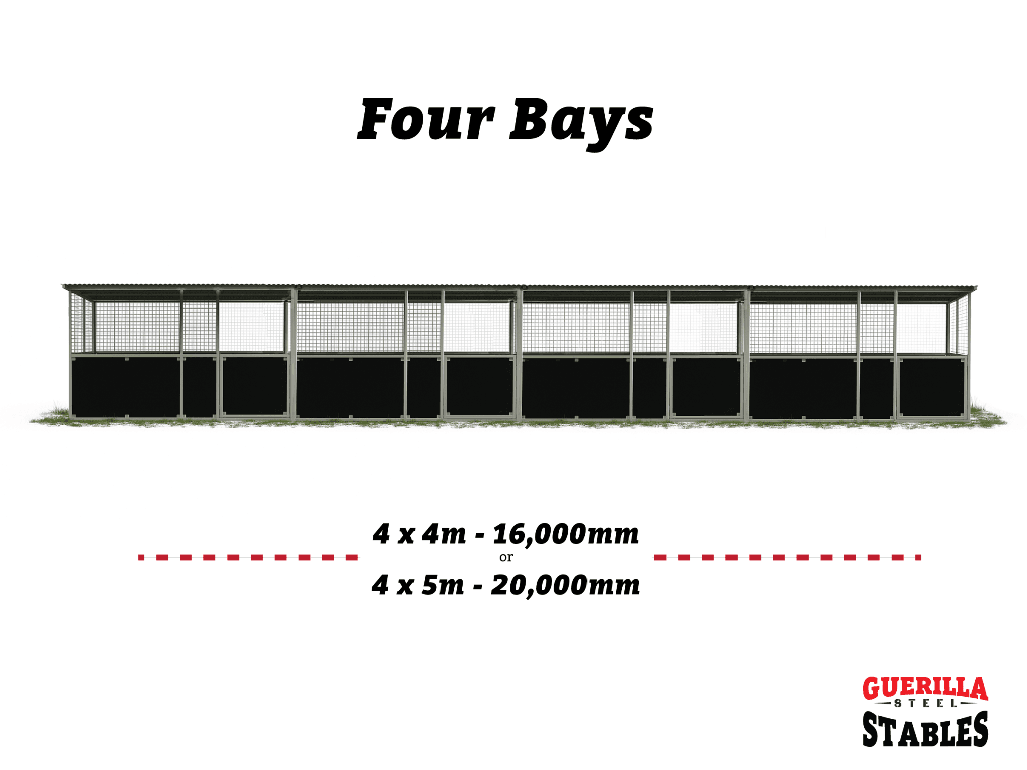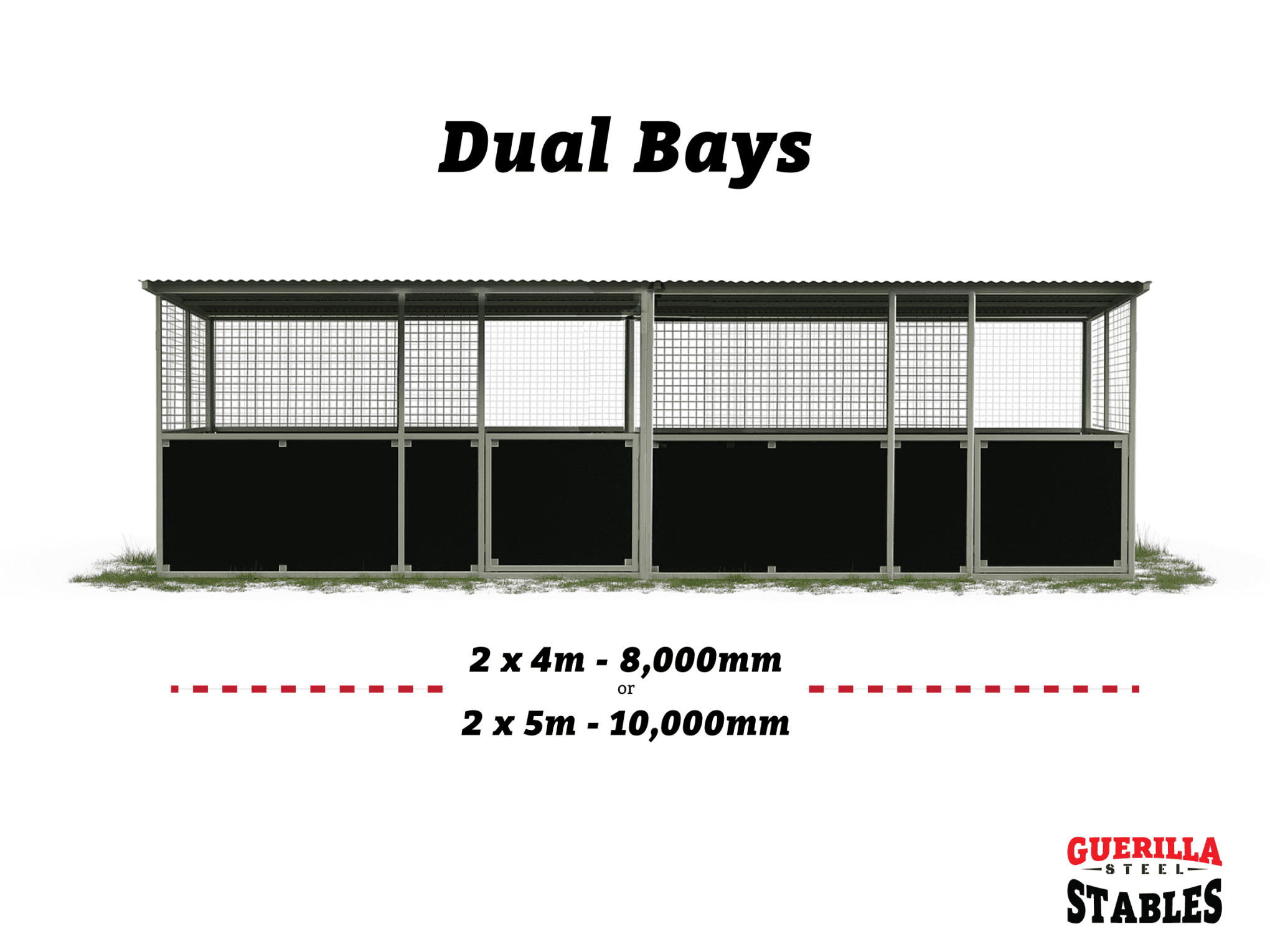 Our modular system lets you choose from 4×4m, 4×5m, and 5×5m bays, then configure them as inline stables, opposing stalls with a breezeway, tack rooms, wash bays, feed rooms, or full equine complexes. Every bay connects seamlessly, so you can start small and expand anytime.